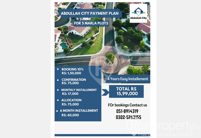 Abdullah City Islamabad is a new housing society that is offering the best properties in it. It is simply a fabulously planned residential area where you will be served with the best services and facilities. It is a project by well known and experienced real estate developers. Abdullah City is an extraordinary real estate initiative. It is in itself a complete metropolis providing every need in one place. This is an unmatchable housing society in Islamabad when it comes to quality build standards at the best prices 5 Marla Plots are available for Sale at Abdullah City Islamabad Chakri Road Ideal location near Motorway M2 and New Airport Islamabad. Basic Facilities Features at Abdullah City Beautiful Entrance Gated Community and Boundary Wall Street lights Green Belts 24 Hours Security as well as CCTV Cameras Provision of Electricity Water as well as Sui Gas Fresh and Clean Drinking Water Book Your Plot Now