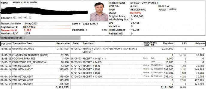 1. 5 Marla plot for sale in Etihad Town, Phase 2. Plot No. 454, Block A 3. I am the owner of the plot 4. Rs. 3,171,000 is paid out of Rs. 3,993,785 5. Situated on 50 feet road along with 1 kanal series of plots 6. Location is ideal because of 50 feet road and natural ventilation 7. Only serious buyers are welcome