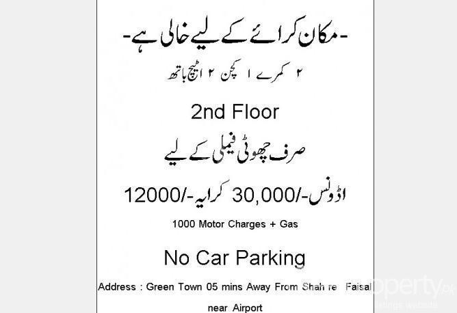 Aparment for Rent 2 Rooms 1 Kitchen 2 Attach Bath only for Small family 2nd Floor No Car Parking Available Advance 30,000/- Monthly Rent 12000/- Discount Availble for Govt. Employee 1000 Water motor + Gas Charges Area Green Town Pather Road Phone zero three four one two zero two five four three zero